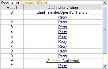 This window displays the results for the selected action in the Call Flow and links for changing the results. Modifying action results here causes the call flow display to update to reflect the new flow.