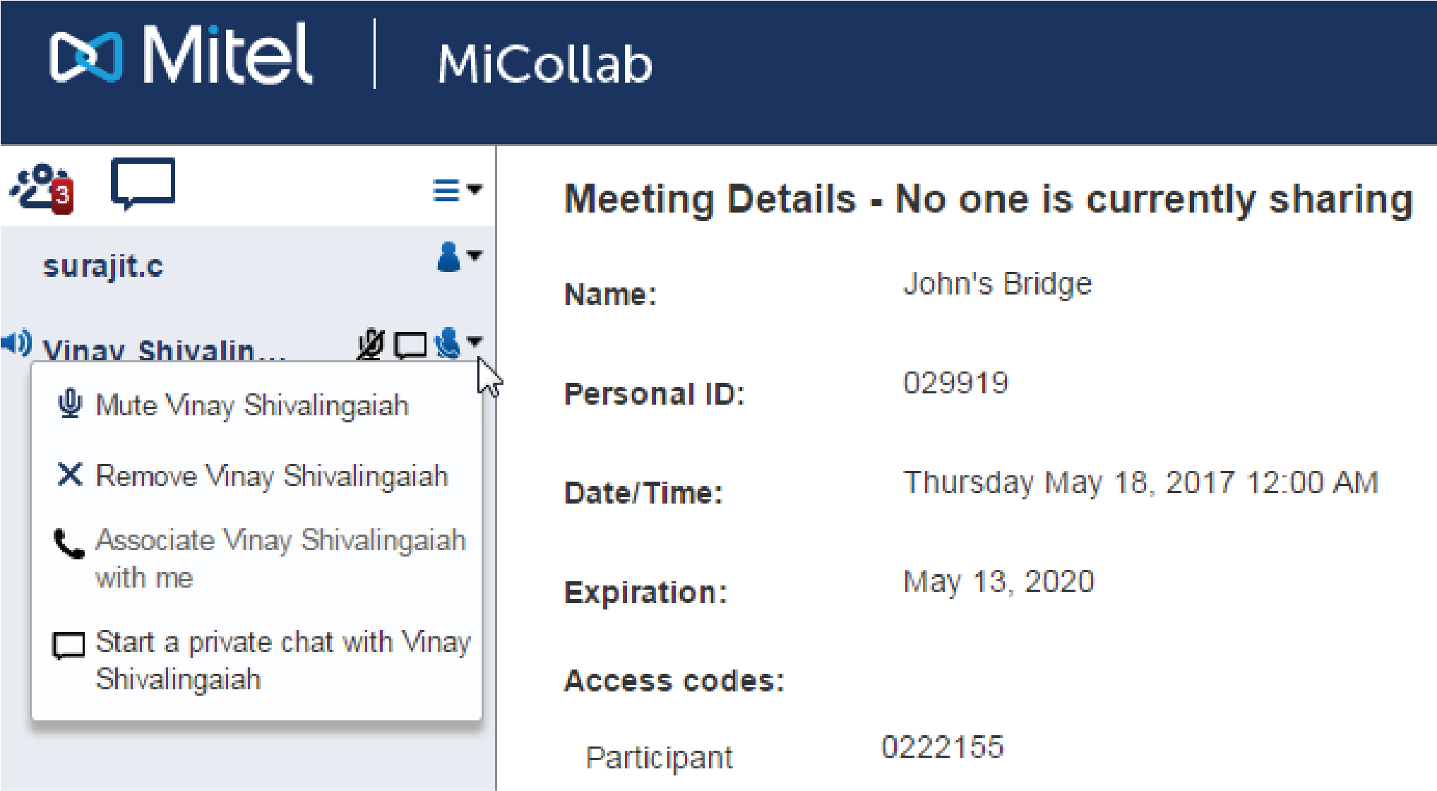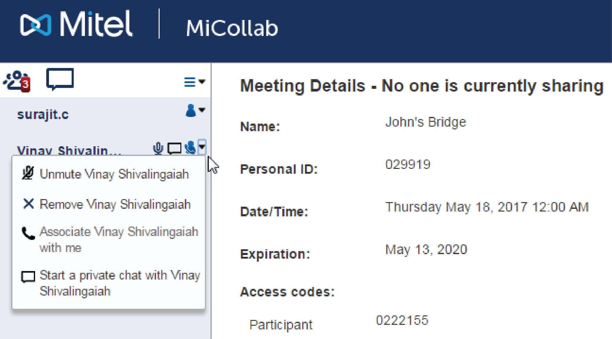 Once your browser has connected to the conference, the Web Client screen is displayed with a list of participants and functions.